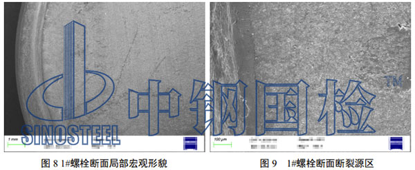 對 3#螺栓斷面進行斷口形貌、斷裂特征觀察,斷裂源區局部已磨平,未見明顯腐 蝕,擴展區可見疲勞輝紋,微觀呈準解理斷裂特征,終斷區為韌窩特征