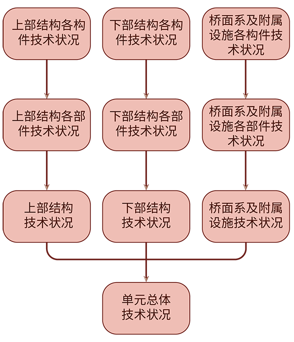橋梁技術狀況評價方法按照《城市軌道交通設施運營監測技術規范第2部分:橋梁》(GB/T 39559.2—2020)中的相關內容進行。即橋梁技術狀況的評價應采用計權重的多項指標分層綜合評定的方法。分層綜合評定采用分值制進行。