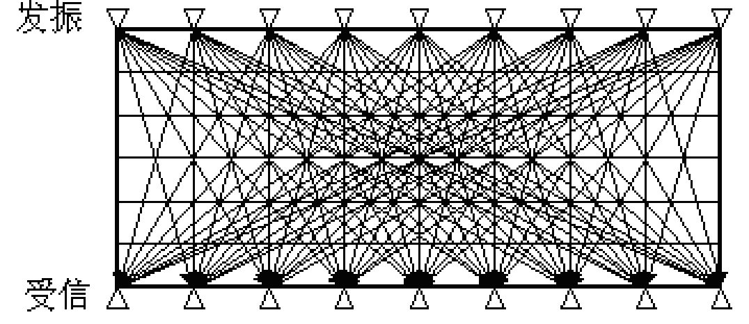 彈性波CT技術的測線源為彈性波(P波),每個激振點可以形成多條彈性波射線,彈性波在穿透介質時,波速的快慢與介質的完整性、密度、彈性模量和剪切模量等因素有關,在混凝土結構無損檢測應用中,被檢測對象密度越大、強度越高、完整性越好,則彈性波傳到速度就越快,衰減越小;如果被檢測對象破碎疏松、振搗不密實、強度較低,則彈性波不僅傳導波速會低,還衰減很快。