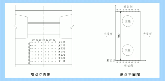在另一檢測項目中,檢測對象同樣為某鐵路特大橋零號塊,根據現場實際情況進行測點布置,分別在測試部位距離底板底面30cm、60cm、90cm、120cm、150cm、180cm、210cm處布置7個檢測斷面,每個檢測斷面布置8個測點,測點間距為30cm,測試寬度為210cm,測試長度800cm,測點布置如圖: