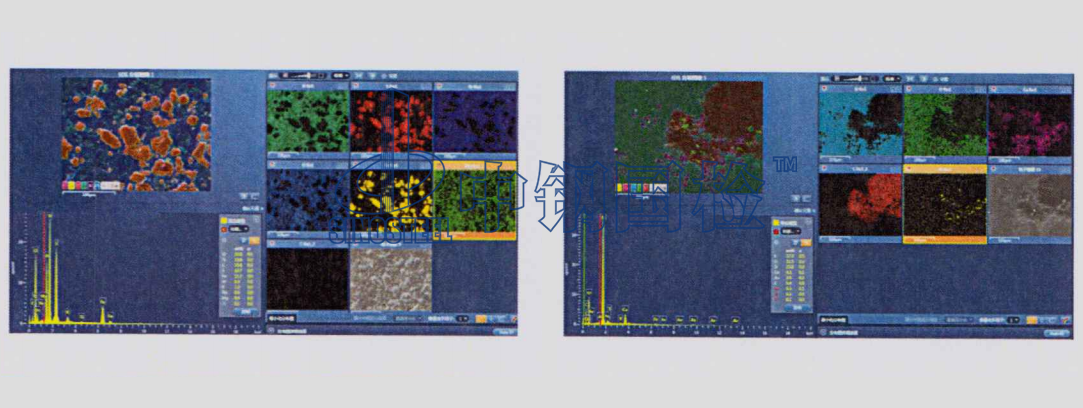 隨后,對同一樣品通過能譜分析進一步觀察分析,以獲得更多的數據。采用多點掃描及面掃描,該碎石樣主要由O、Si、C、Al、Ca、Fe、S等元素組成,其中O、Si分布較均勻且含量較高,Al、Fe、S等元素多集中分布,存在部分以Fe、S元素為主要組成的礦物。