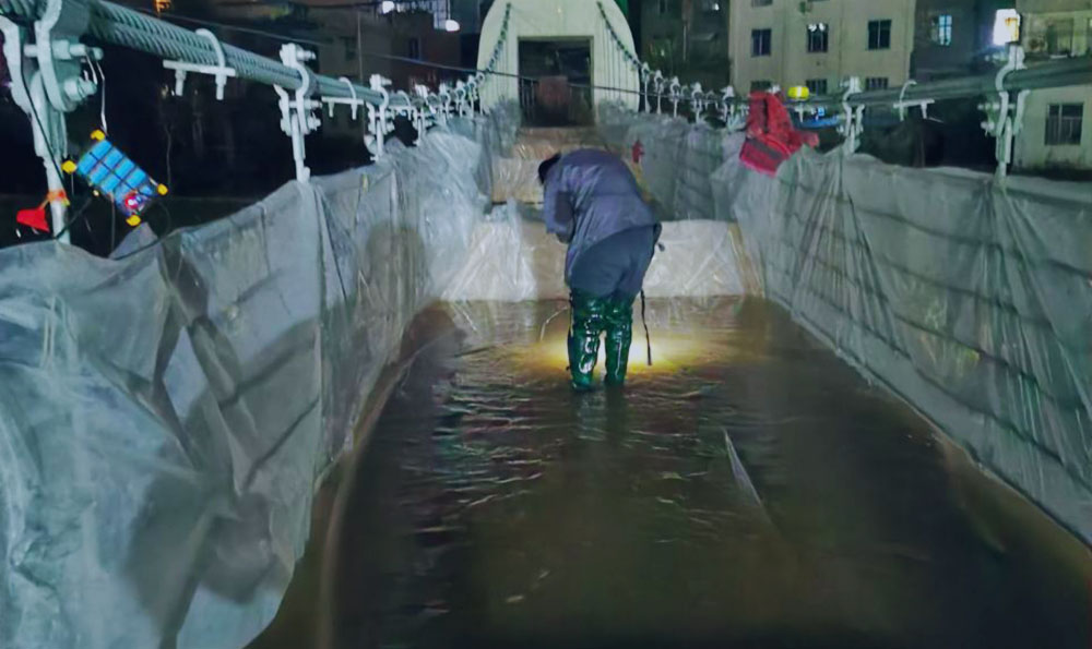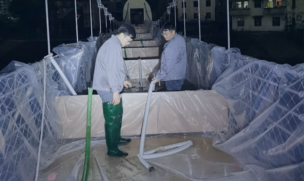 采用水袋壓重需要注意懸索橋各部分壓力的合理分布,嚴格控制水量。為了保證項目檢測效率,獲得準確的數據結果,檢測人員克服現場多重困難,不顧冬日里水的冷和黑夜里風的寒,認真細致的進行每一個環節。