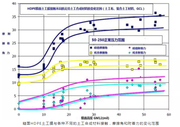 糙面土工膜和光面土工膜最大的不同源于表面的摩擦系數,而表面剪切強度和摩擦角,是體現表面摩擦系數的重要指標。國際土工合成材料協會做過大量的測試,發現糙面高度是能影響土工膜的表面剪切強度和摩擦角的重要參數。測試證明一個合適的糙面高度,將會增加糙面土工膜的剪切強度和摩擦角,使糙面土工膜在使用中更加的穩定。一般來說,糙面高度越高,摩擦系數越大。