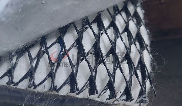 復合排水網最終是各組成部分共同作用,所以還要對其復合體進行強度等方面的檢測。很多產品由于土工布和排水網芯二者拉伸性能和機理的差異,使復合體的拉伸強度不能很好的同步疊加,在復合體拉伸直至材料全部斷裂過程中,拉伸強度的提高并不明顯。