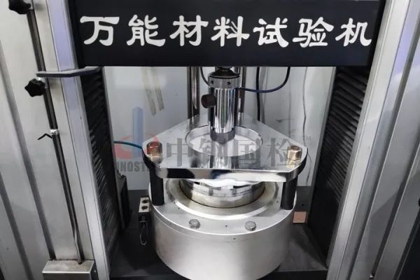 將試樣放入環(huán)形夾具內(nèi),擰緊,防止試樣在刺破過(guò)程中滑動(dòng)或破損。將夾具放在材料試驗(yàn)機(jī)上,調(diào)整高度,應(yīng)使試樣與圓球頂桿剛好接觸。開(kāi)啟試驗(yàn)機(jī),記錄試驗(yàn)過(guò)程中頂壓力-變形曲線(xiàn),直至試樣完全頂破,記錄最大頂壓力。停機(jī),取出已破壞試樣,觀察和記錄頂破情況。