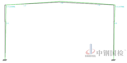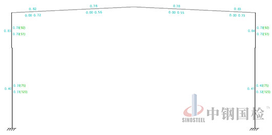 根據以上檢測及勘查結果和委托方提供的圖紙等資料,承載能力驗算考慮風荷載、雪荷載、自重等。 依據《鋼結構設計標準》GB 50017-2017、《建筑結構荷載規范》GB 50009-2012等規范并結合其使用環境及功能,利用模型計算軟件進行建模驗算分析。 結果圖例如下: