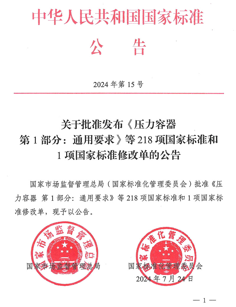 關(guān)于批準(zhǔn)發(fā)布《壓力容器 第1部分:通用要求》等218項(xiàng)國(guó)家標(biāo)準(zhǔn)和1項(xiàng)國(guó)家標(biāo)準(zhǔn)修改單的公告