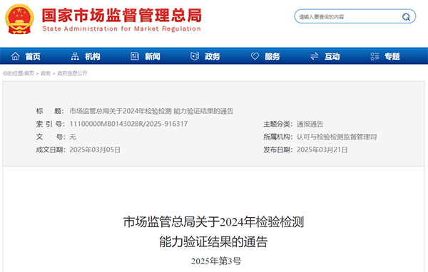 為了規范檢驗檢測市場,持續提升檢驗檢測機構技術能力,市場監管總局根據有關規定,對部分檢驗檢測機構組織開展了2024年度檢驗檢測能力驗證工作。日前,市場監管總局發布2025年第3號通告,公布了市場監管總局關于2024年檢驗檢測能力驗證結果的相關情況。