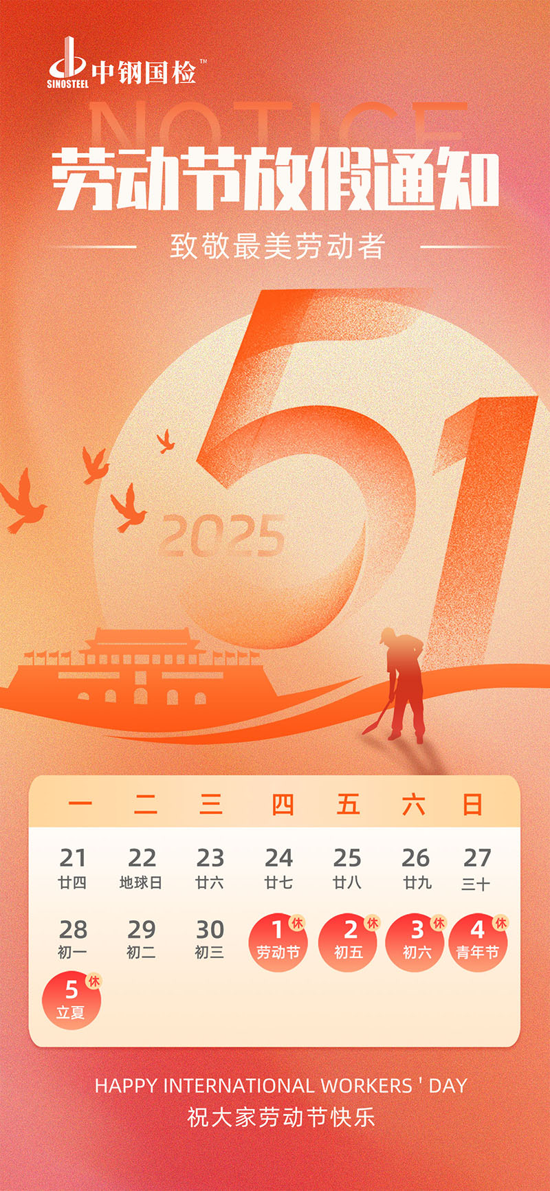 值此五一勞動節之際,中鋼國檢向每一位奮斗者致敬!愿您在假期中卸下疲憊,擁抱生活的美好。同時,無論是工作,還是出行,也請大家注意個人安全與健康,讓美好與歡樂始終相伴。