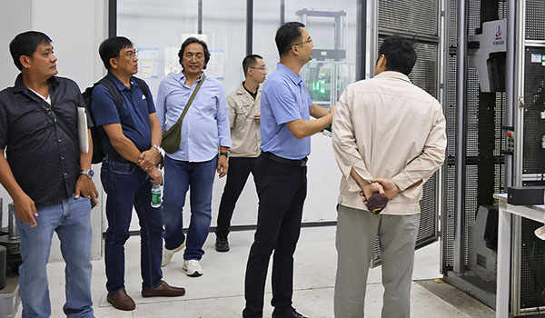 在專業人員的引領下,菲律賓公共工程與公路部中央助理部長Loreta M. Malaluan一行走進試驗室,實地查看中鋼國檢試驗室條件、檢測設備等,并對菲律賓卡馬拉尼甘大橋項目中所使用的鋼絞線、錨具等關鍵材料的檢驗檢測過程進行觀摩見證。