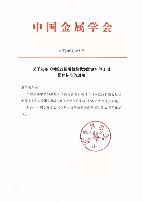 近日,中國金屬學會發布通知,《鋼絲拉拔用粉粒狀潤滑劑》等5項團標獲得中國金屬學會標準化工作委員會的審核,批準并正式發布。