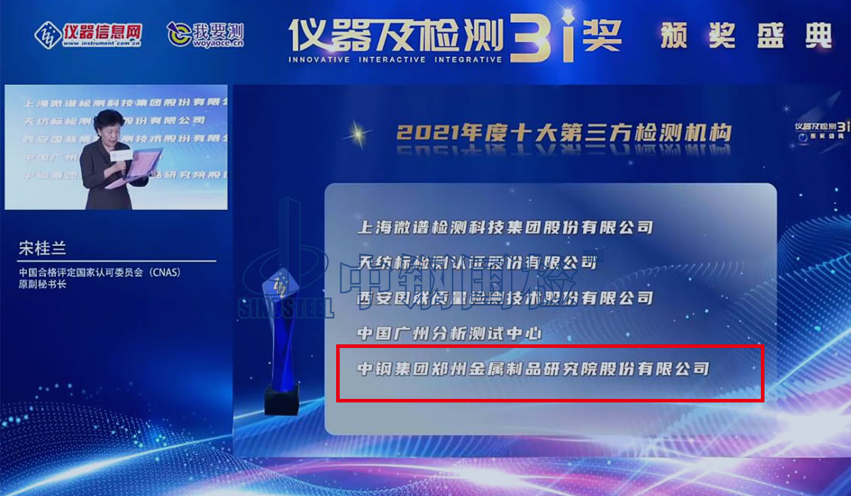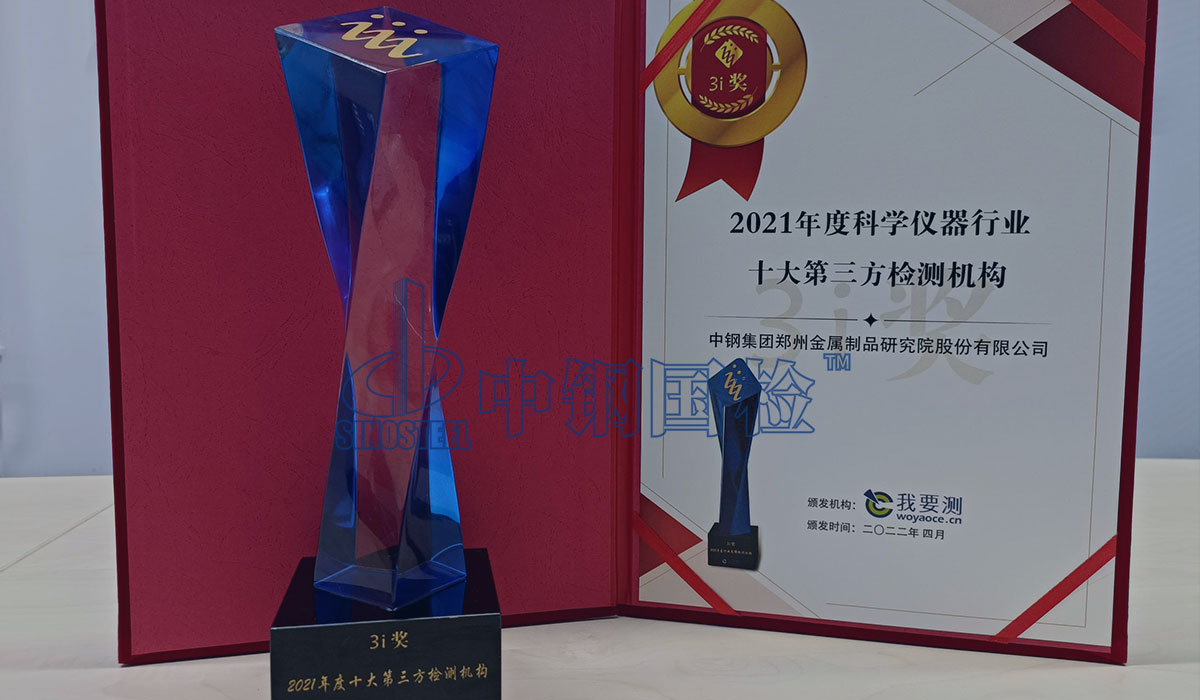 我要測網“2021年度十大第三方檢測機構獎”評選活動是由我要測網舉辦的旨在發掘并表彰綜合實力、專業能力、服務質量等多方面表現突出的第三方檢測機構,進而推動行業健康、規范、有序、快速發展。儀器及檢測3i獎,簡稱“3i獎”,代表著創新(innovative)、互動(interactive)、整合(integrative)。獲得此項榮譽,不僅是中鋼國檢實力不斷發展的結果,更是社會各界對中鋼國檢所取得成績的高度認可。