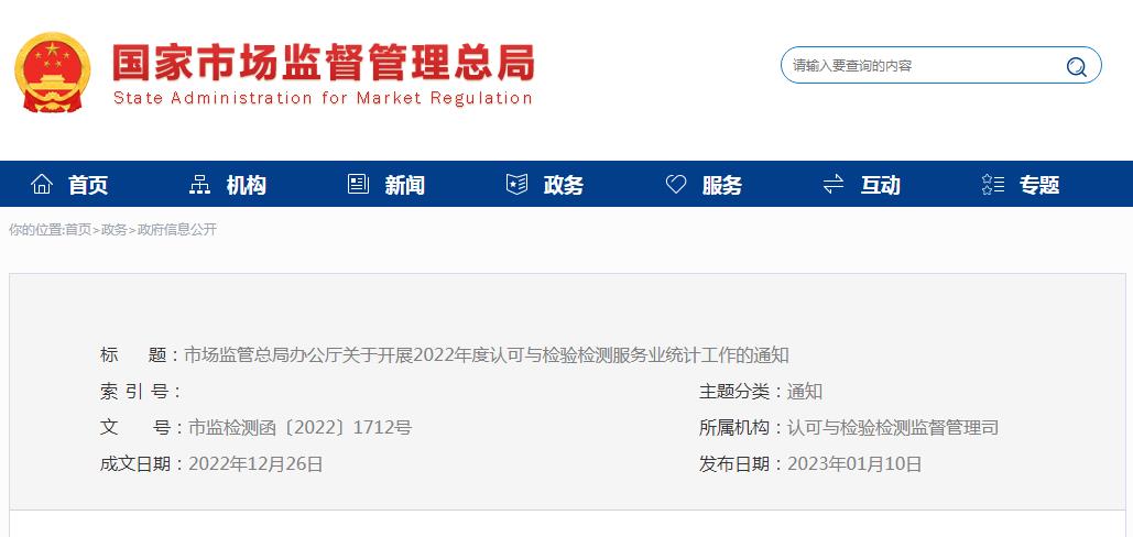 2023年1月10日,國家市場監督管理總局發布《市場監管總局辦公廳關于開展2022年度認可與檢驗檢測服務業統計工作的通知》,對開展2022年度認可與檢驗檢測服務業統計工作有關事項作了具體部署。