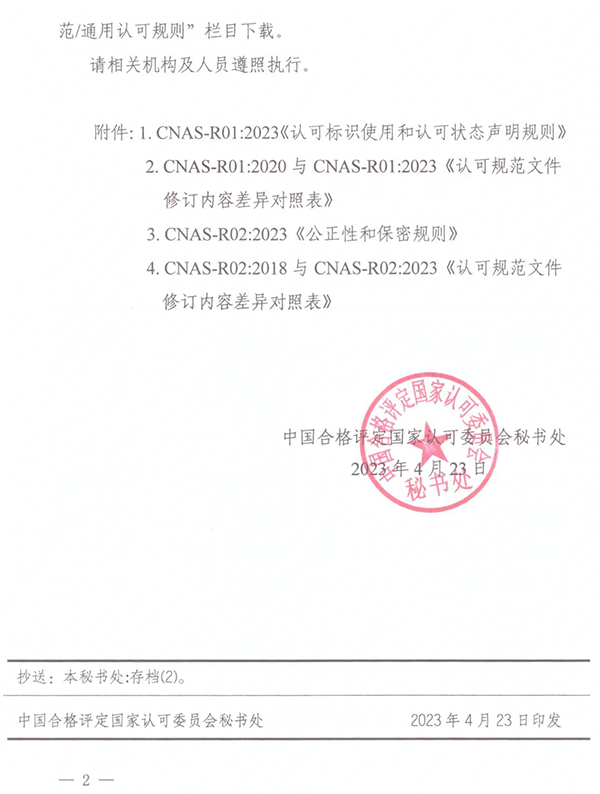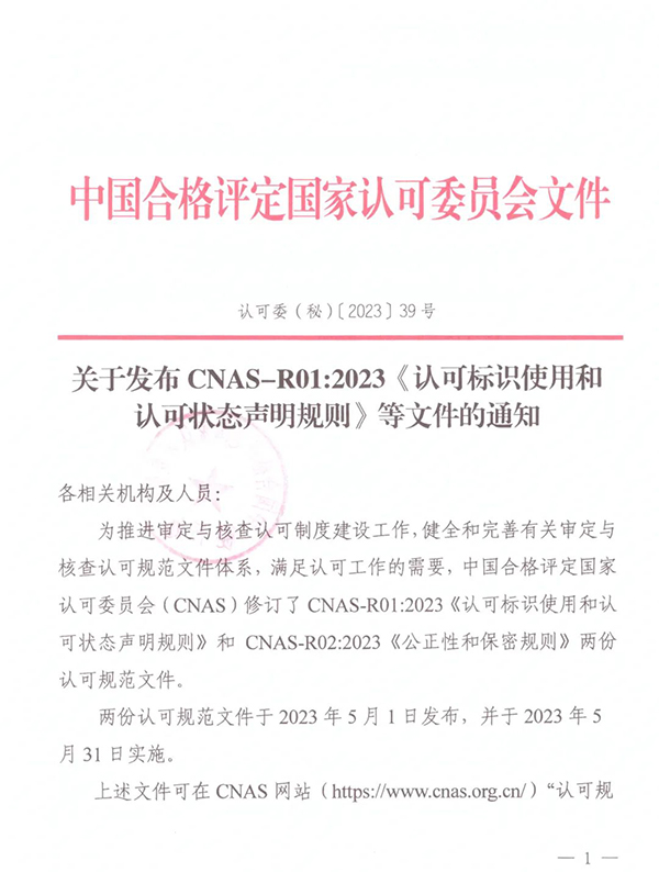 中國合格評定國家認可委員會(CNAS)發布相關通知,于2023年5月1日公開發布CNAS-R01:2023《認可標識使用和認可狀態聲明規則》、CNAS-R02:2023《公正性和保密規則》兩份文件,并將于5月31日實施。