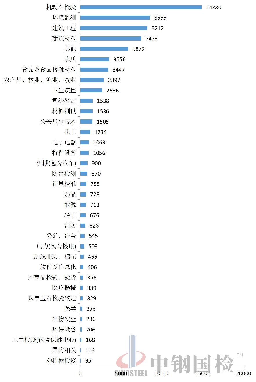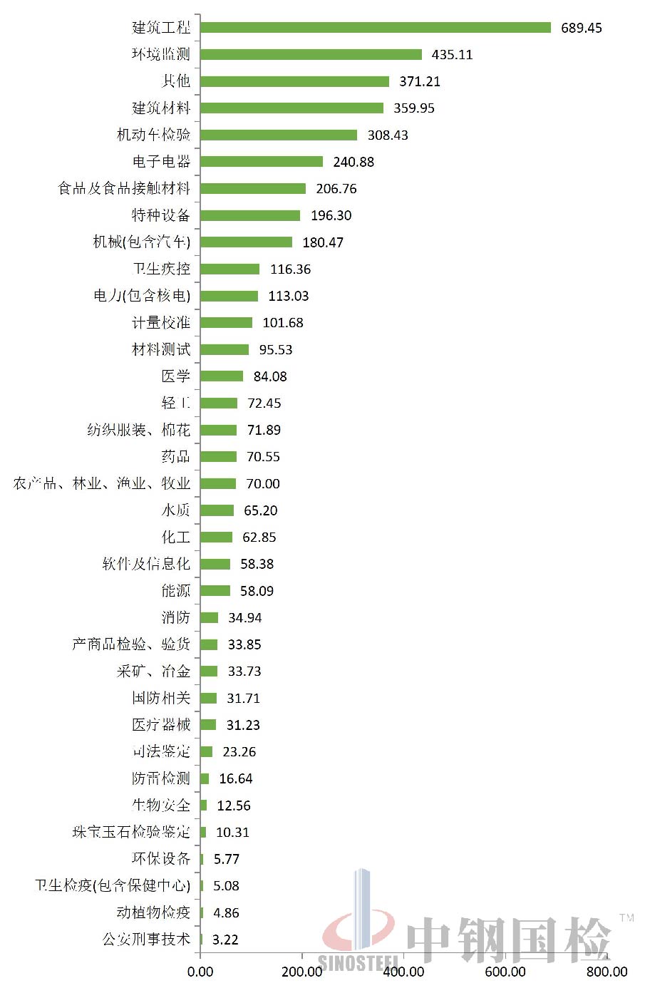 營收排在前十位的檢驗檢測領域為:建筑工程(689.45 億元)、環境監測(435.11 億元)、其他(371.21 億元)、建筑材料(359.95 億元)、機動車檢驗(308.43 億元)、電子電器(240.88 億元)、食品及食品接觸材料(206.76 億元)、特種設備(196.30 億元)、機械(包含汽車)(180.47 億元)、衛生疾控(116.36億元)。
