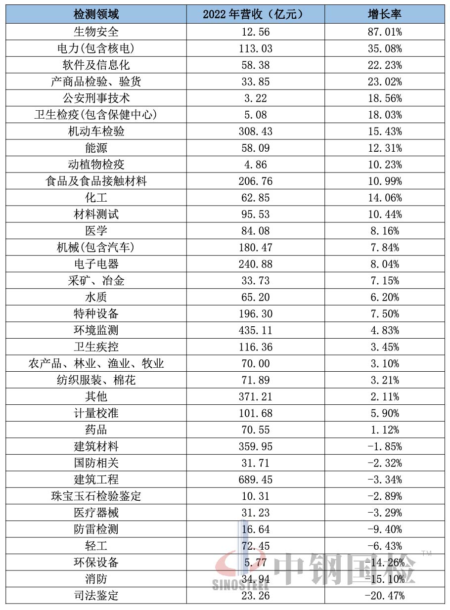 電子電器等新興領域〔包括電子電器、機械(含汽車)、材料測試、醫學、電力(包含核電)、能源和軟件及信息化〕繼續保持高速增長。2022 年,這些領域共實現收入 830.47 億元,同比增長 12.57%,高于全行業營收增速 8.03 個百分點。