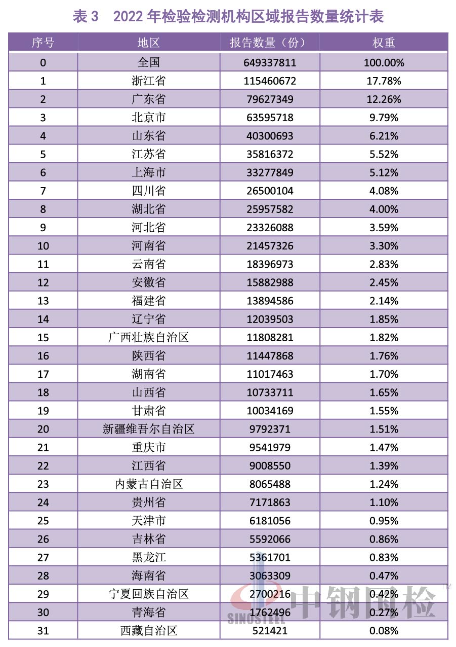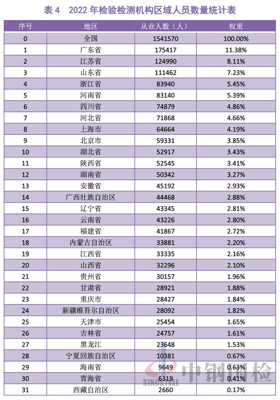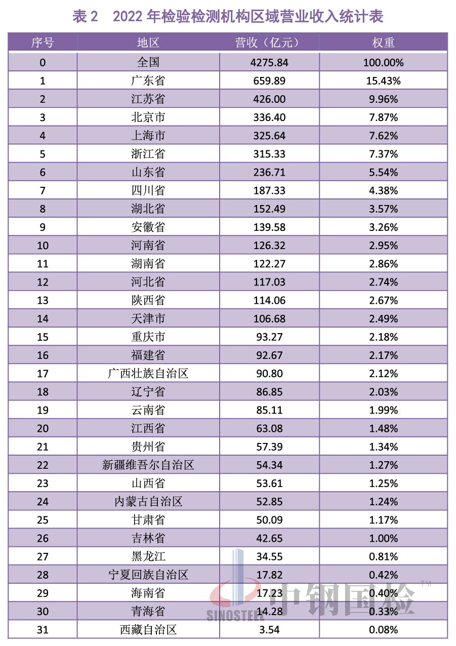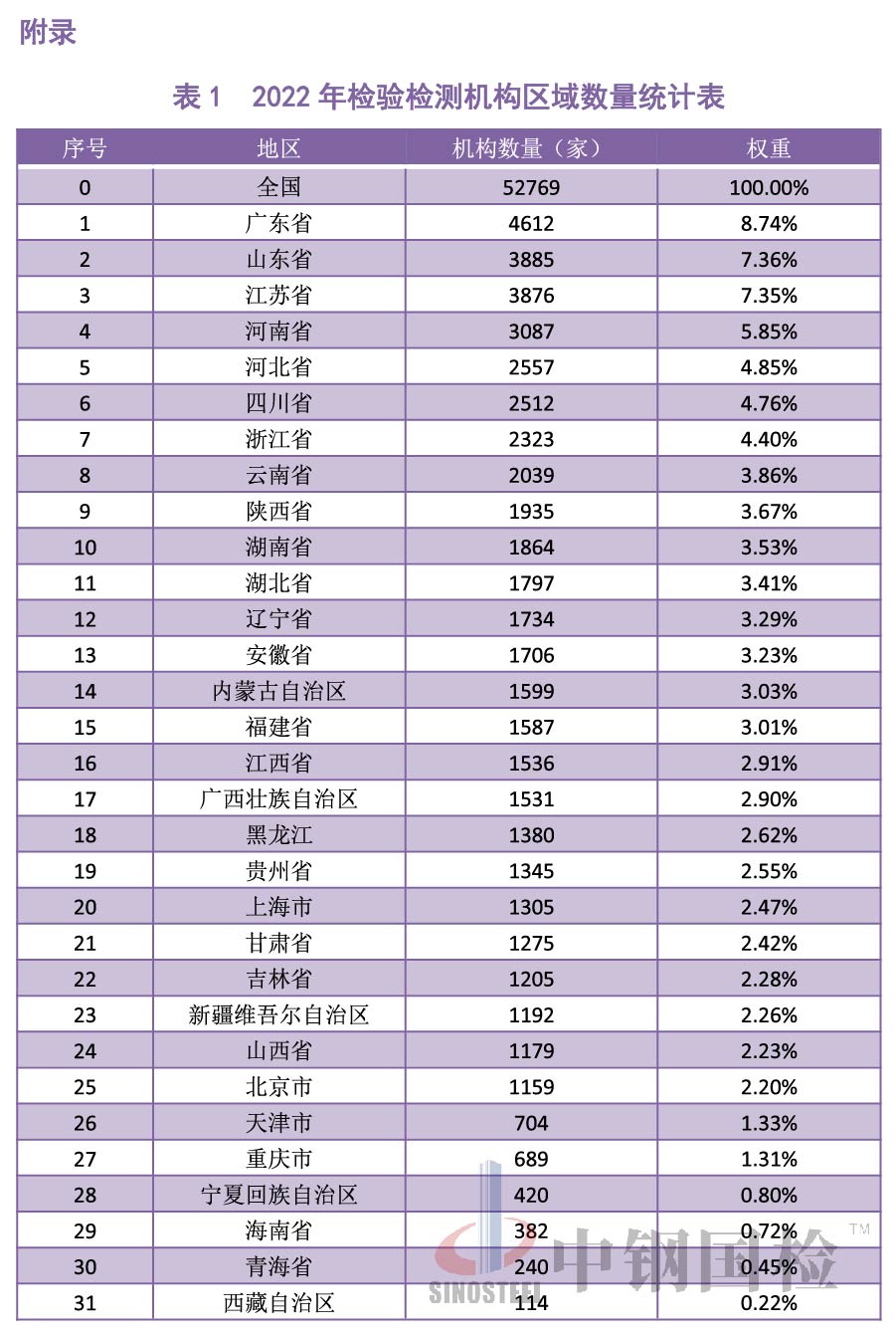 截至 2022 年底,我國獲得資質認定和其他專業領域法定資格、資質的各類檢驗檢測機構共有 52769 家,全年實現營業收入共4275.84 億元,全年向社會出具檢驗檢測報告共 6.5 億份,共有從業人員 154.16 萬人,擁有各類儀器設備 957.54 萬臺套,全部儀器設備資產原值 4744.75 億元,檢驗檢測機構實驗室面積 10423.51 萬平方米。