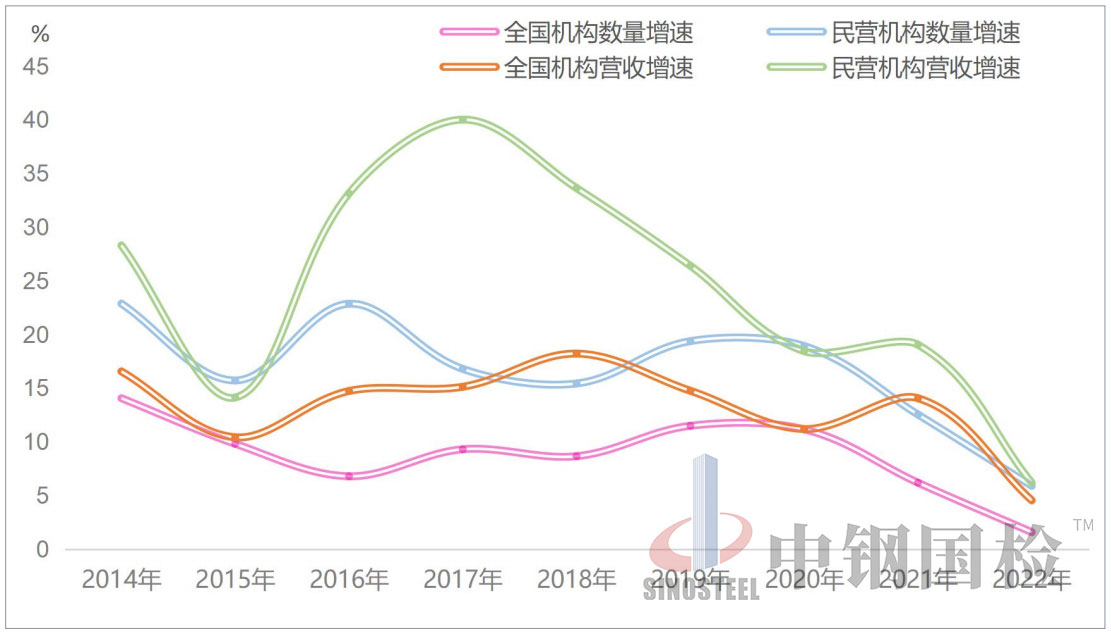 圖 1-2 2014-2022 年全行業和民營檢驗檢測機構數量及營收增速情況