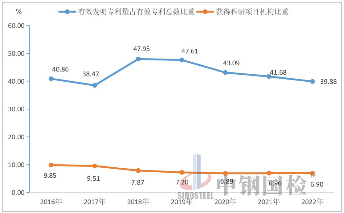圖 1-7 2016-2022 年有效發明專利量占有效專利總數比重情況和獲得科研項目機構比重情況