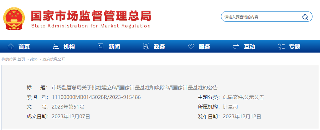 市場監管總局關于批準建立6項國家計量基準和廢除3項國家計量基準的公告
